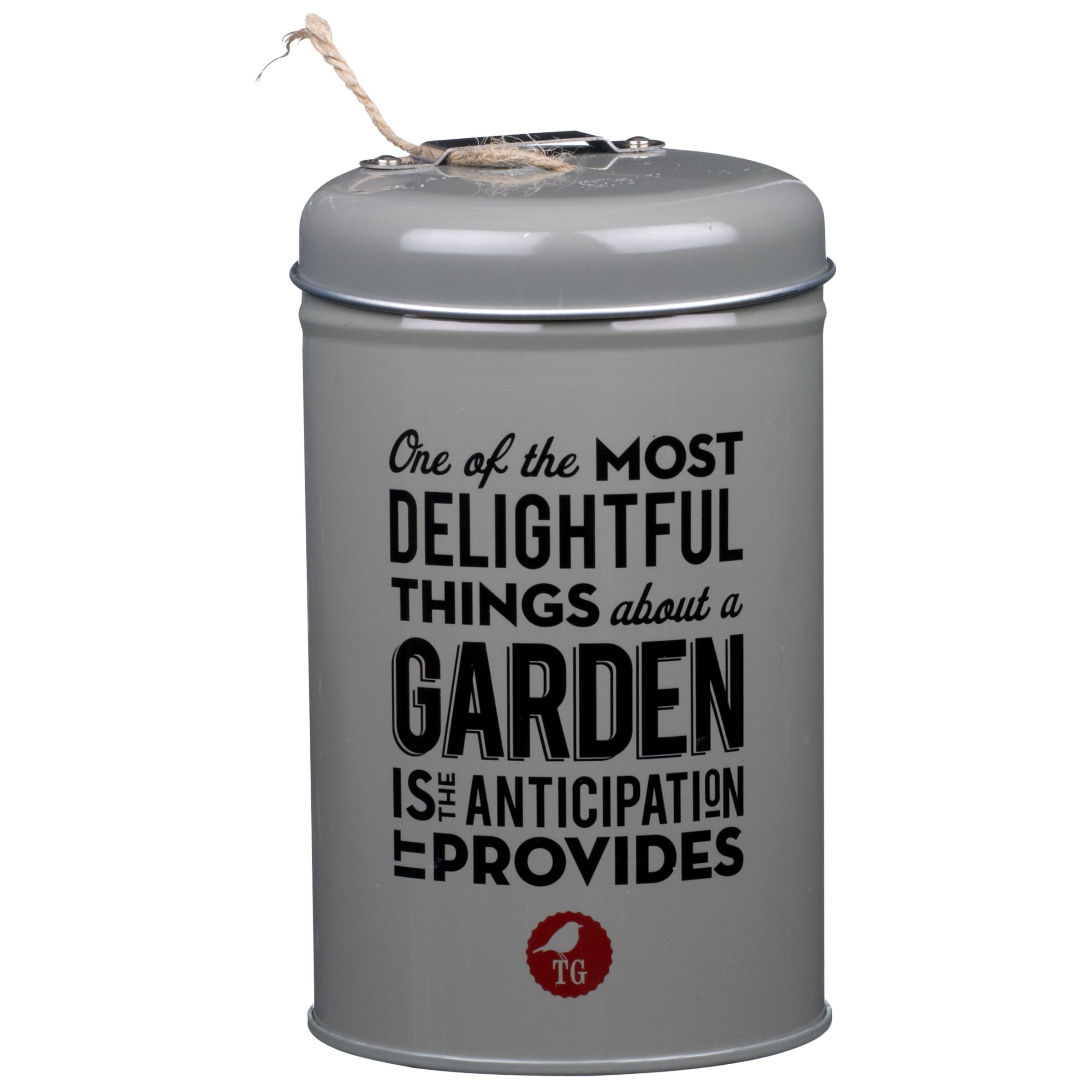 Great for keeping your beloved garden tidy and in order. The 100% tin can is emblazoned with refreshing, inspiring thoughts and features an integrated cutter for the included ball of brown string.