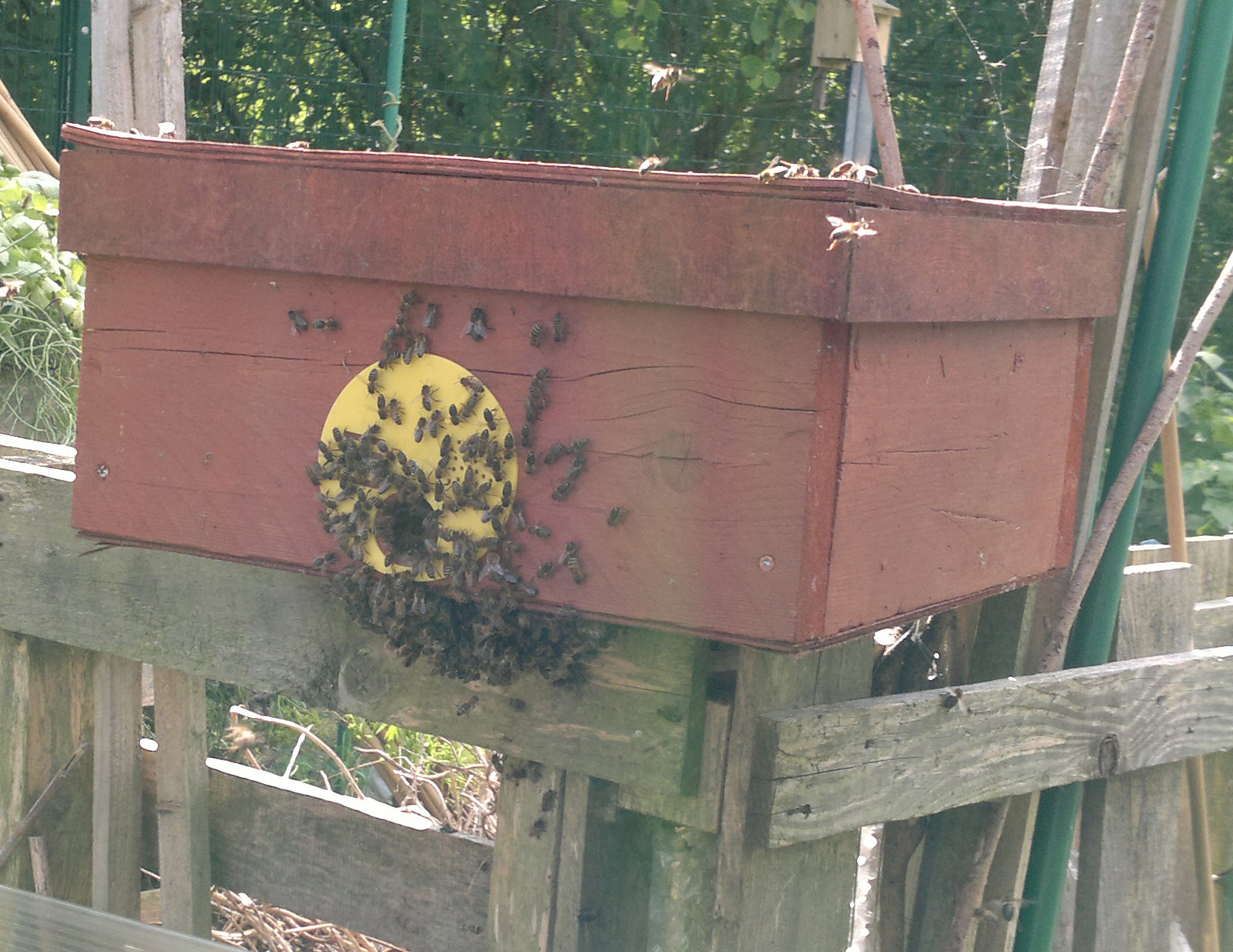 Nic had made me a bait box last year to leave at the churchyard where we knew there were bees. We didn’t get a swarm last year so it spent the winter in my shed. As I’ve filled the shed to the brim with other things it’s had to come outside. I have been meaning to take it up the road – a few hundred meters from our apiary – and put it on a flat garage roof. However, as you can see some bees have found it anyway.